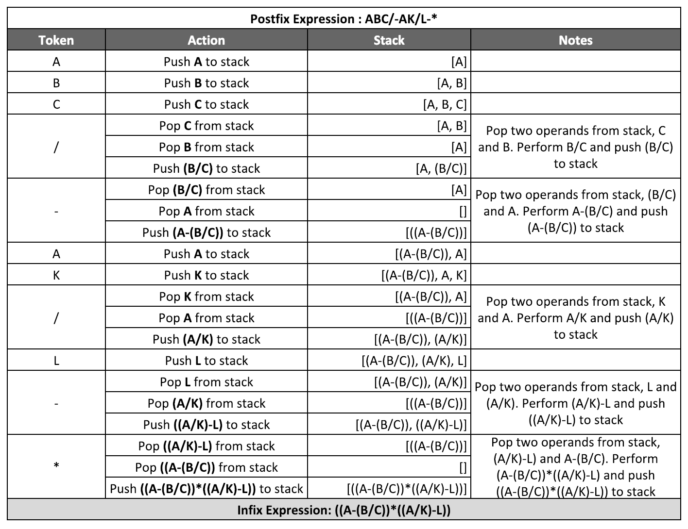 Postfix Expression: ABC/-AK/L-* Infix Expression: ((A-(B/C))*((A/K)-L))